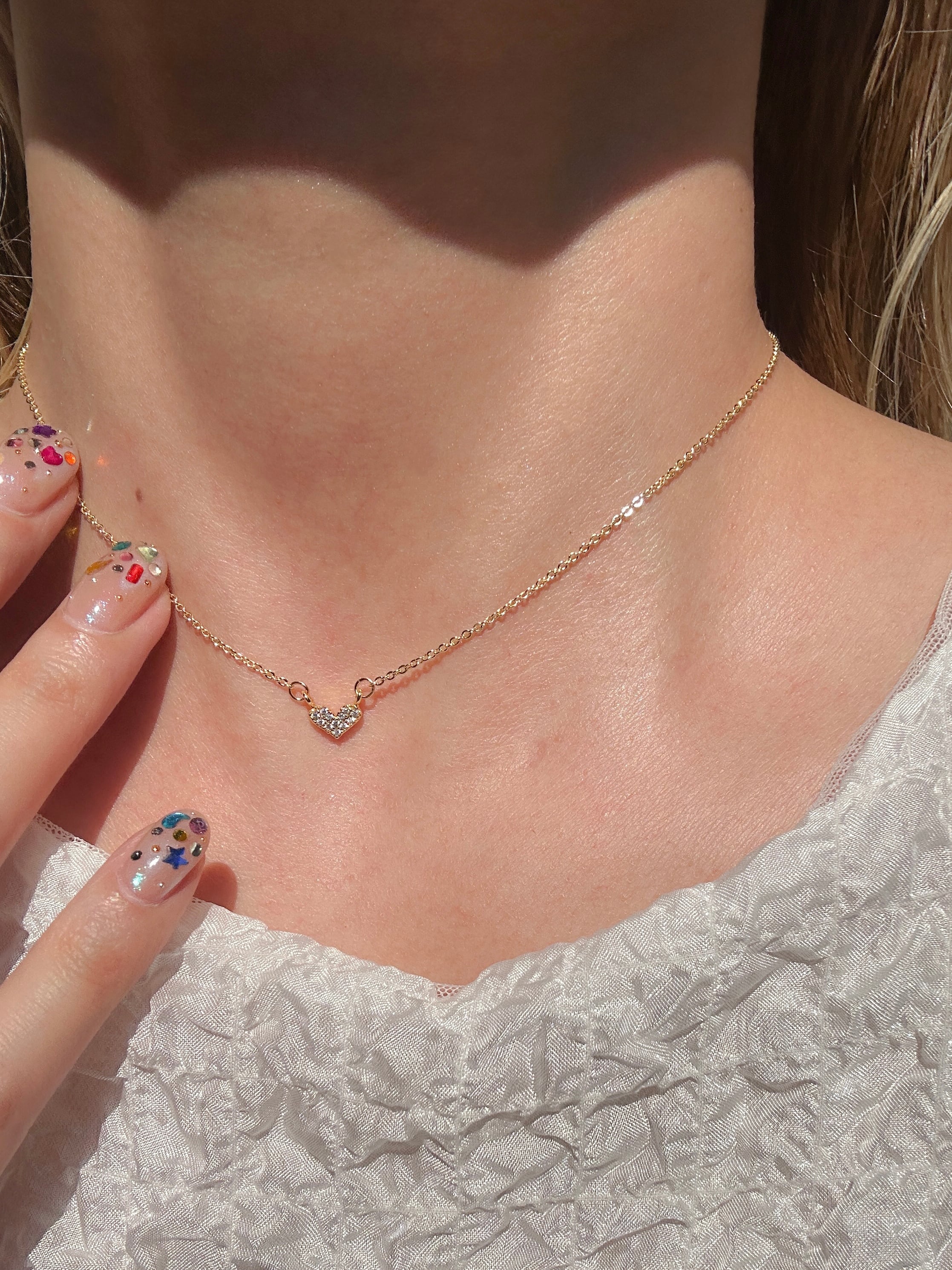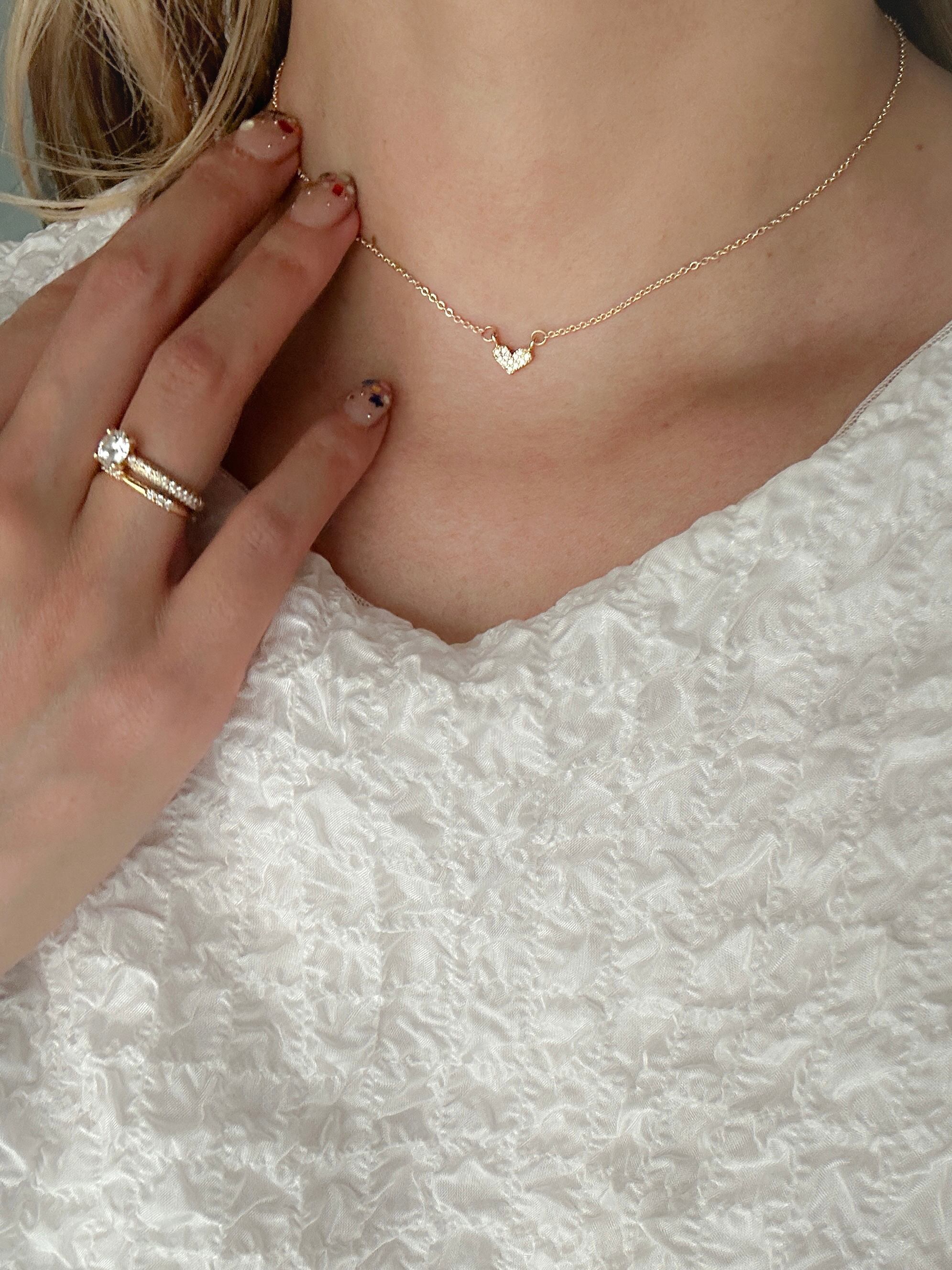 首に沿うような短めの長さになっているので、どんなトップスを着た時にもチラリとパヴェハートが首元を輝かせてくれます✧・゚: *